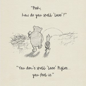 Step back in time to the beloved world of Winnie the Pooh with this meticulously crafted vintage-style black-and-white graphic featuring two inseparable friends walking arm in arm through the wintery Hundred Acre Wood—a timeless scene “in which Pooh and Piglet go hunting and nearly catch a Woozle.” Complemented by the quote, "Any day spent with you is my favourite day. So today is my new favourite day," this print captures the warmth, nostalgia, and innocence of childhood friendships.