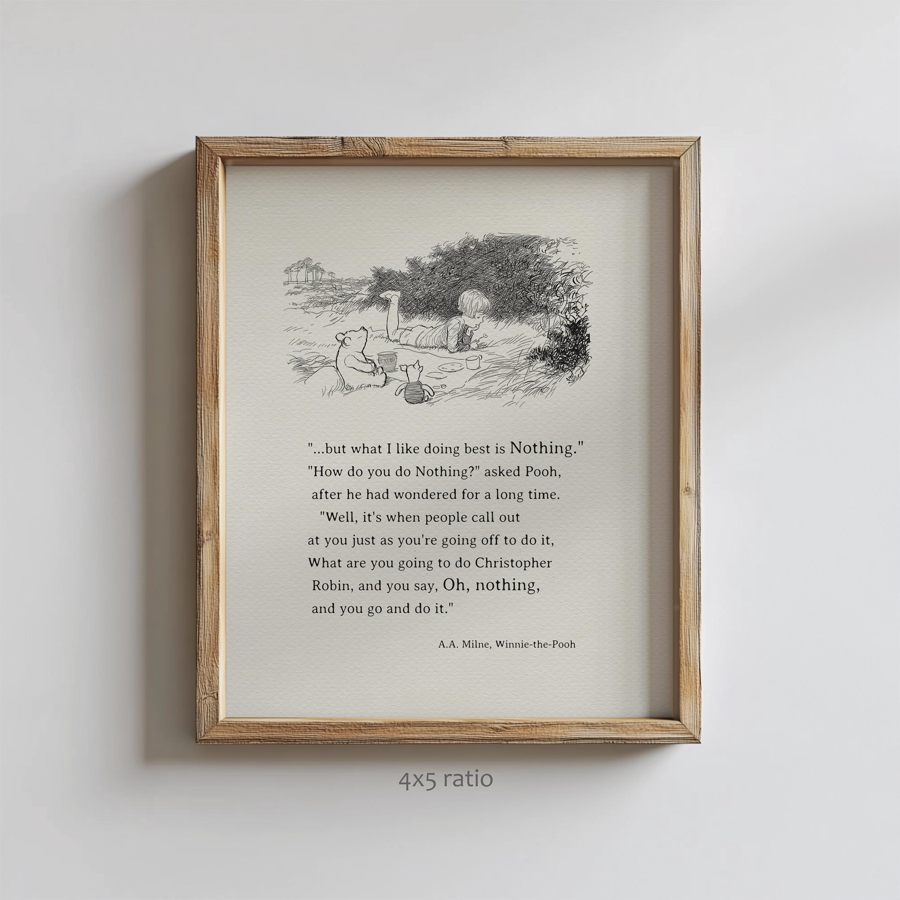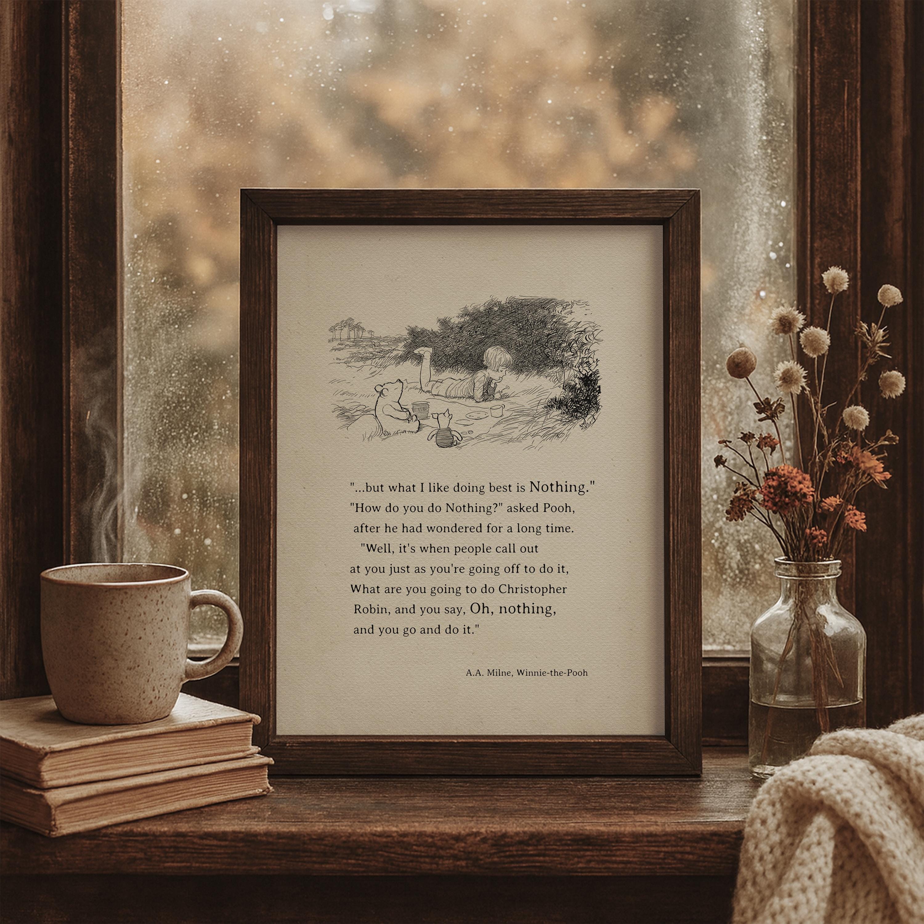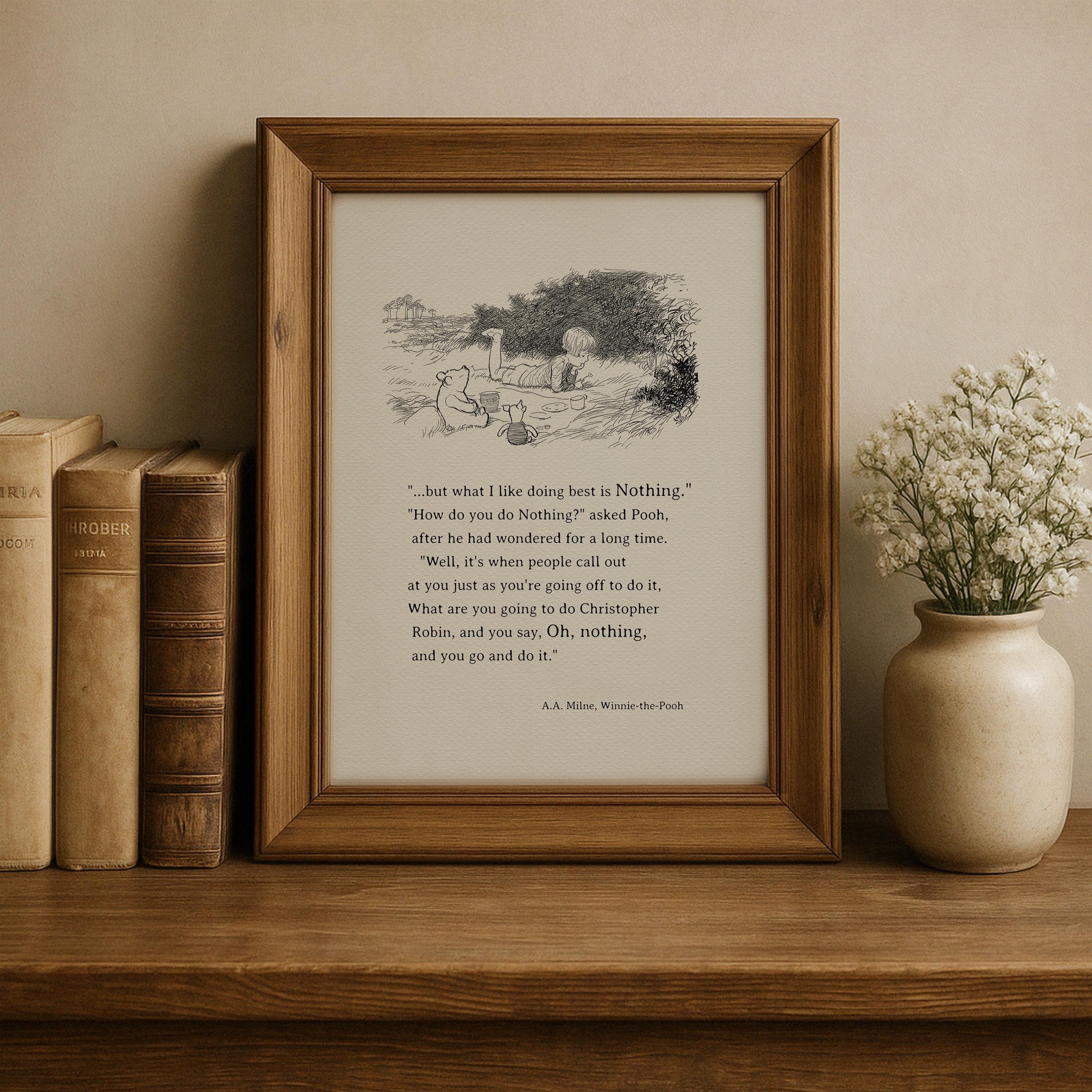 Step back in time to the beloved world of Winnie the Pooh with this meticulously crafted vintage-style black-and-white graphic depicting the timeless scene in which— "one day, when Christopher Robin and Winnie-the-Pooh and Piglet were all talking together, Christopher Robin finished the mouthful he was eating and said carelessly: 'I saw a Heffalump to-day, Piglet." Quote added to this illustration: “.....but what I like doing best is Nothing...” – although it does not come from the same book, it fits this idyllic picnic scene exceptionally well.