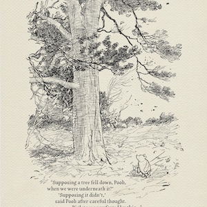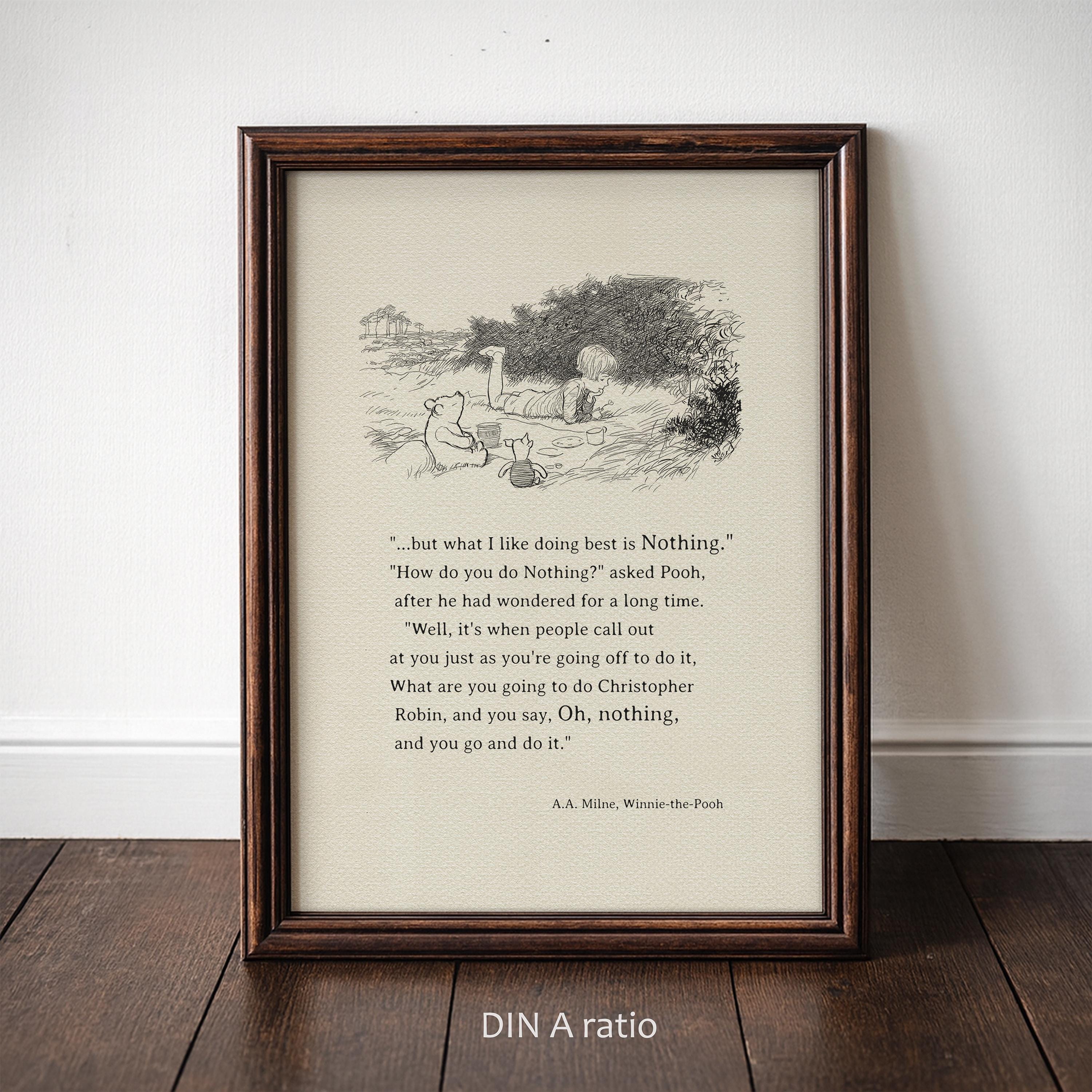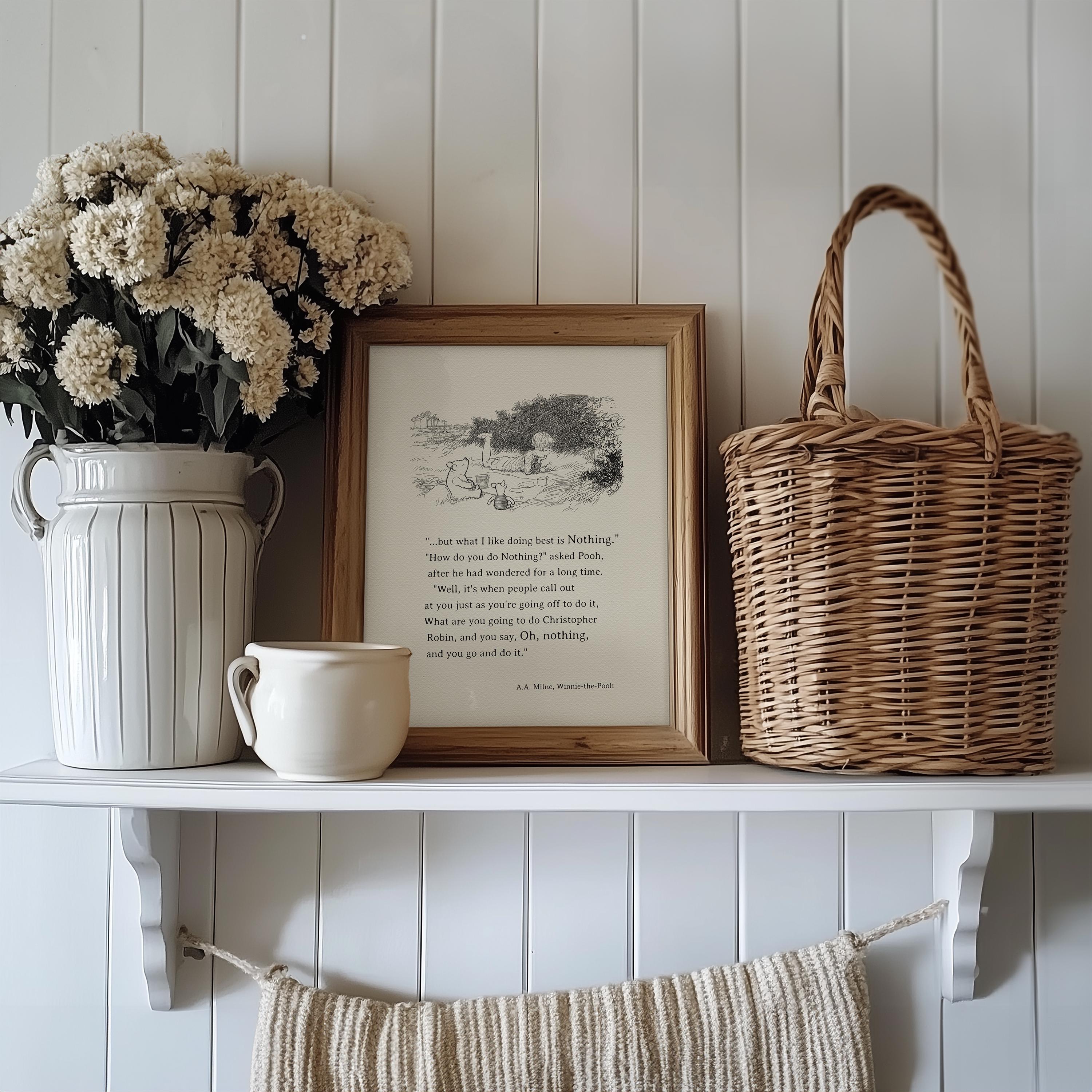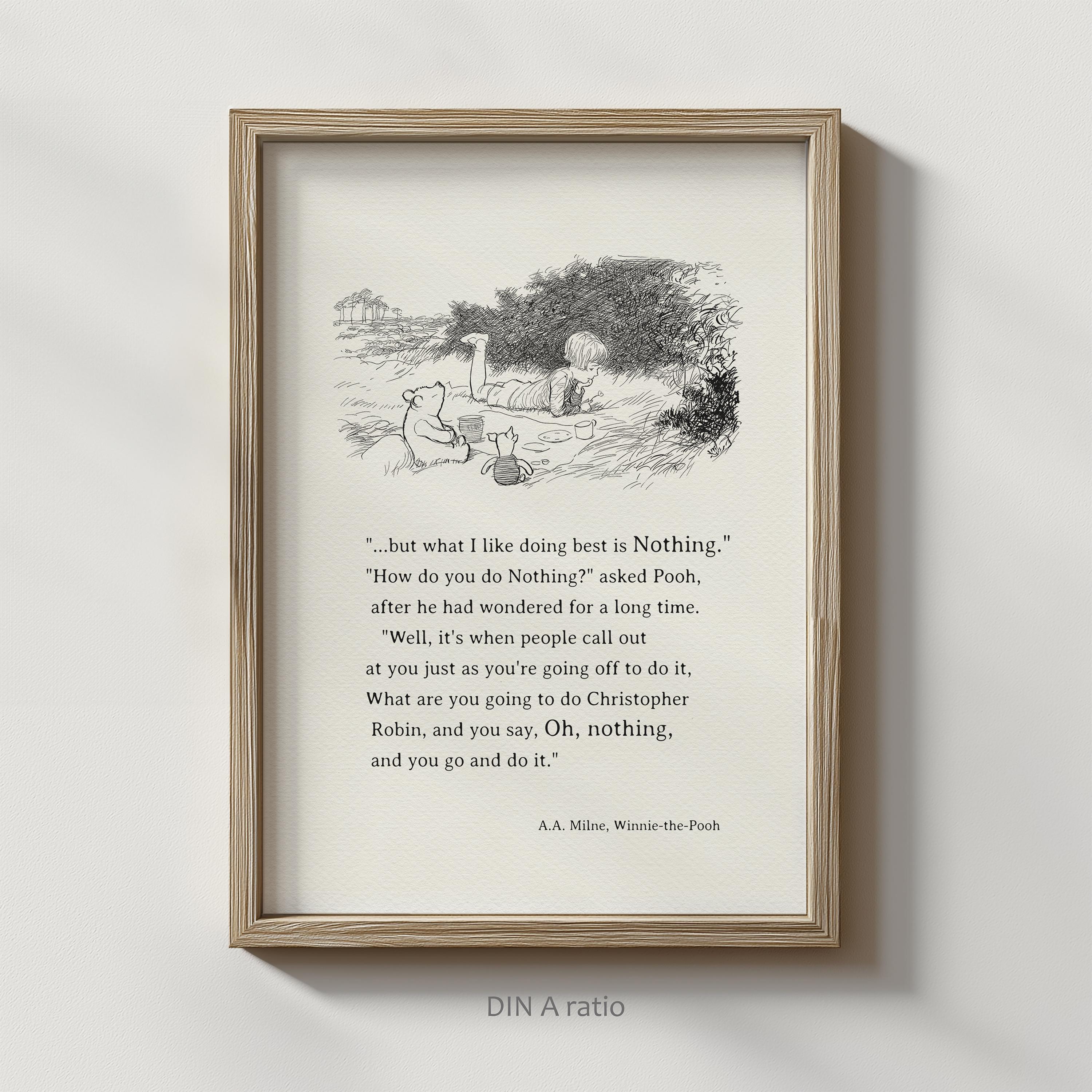 Step back in time to the beloved world of Winnie the Pooh with this meticulously crafted vintage-style black-and-white graphic depicting the timeless scene in which— "one day, when Christopher Robin and Winnie-the-Pooh and Piglet were all talking together, Christopher Robin finished the mouthful he was eating and said carelessly: 'I saw a Heffalump to-day, Piglet." Quote added to this illustration: “.....but what I like doing best is Nothing...” – although it does not come from the same book, it fits this idyllic picnic scene exceptionally well.